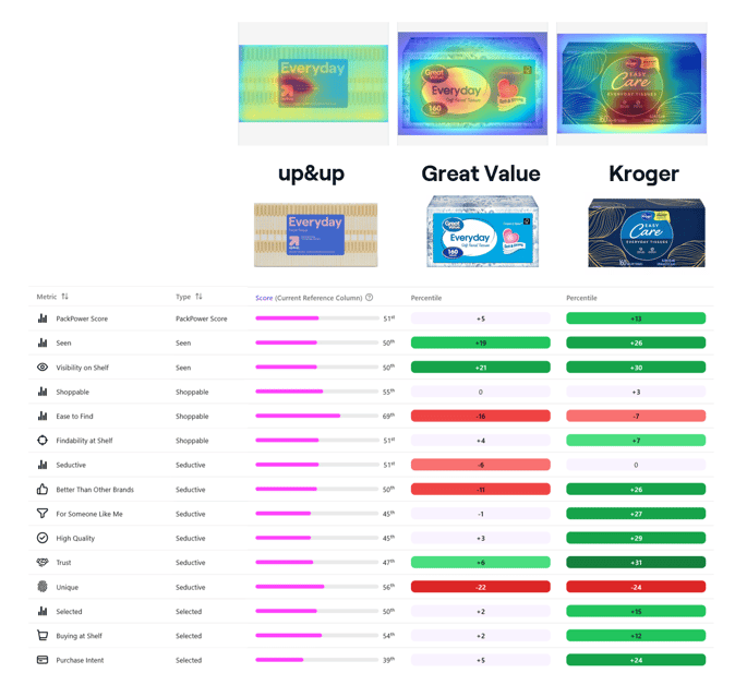 A global CPG brand evaluated 100’s of SKUs across portfolios, which lead to a focus on private label facial tissue packaging. The initial goal was to learn how competing designs influence shopper behavior – and which visual elements drive visibility, findability, and purchase at shelf.